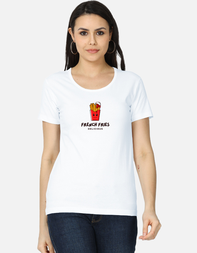 Add fun and comfort to your wardrobe with the Round Neck Women’s “French Fries” T-Shirt. A perfect casual pick—order yours today!