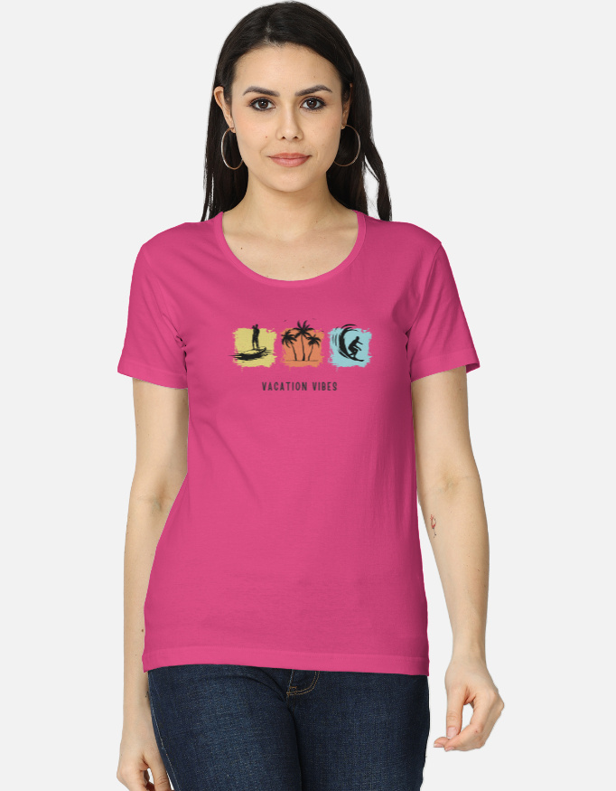 Relax in comfort and style with the Round Neck Women’s “Vacation Vibes” T-Shirt. Enjoy easygoing fashion and everyday comfort—order yours today!