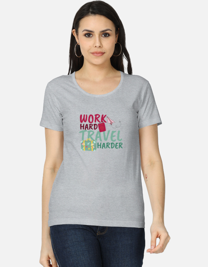 Celebrate your hardworking spirit and adventurous heart with the Round Neck Women’s “Work Hard, Travel Harder” T-Shirt. Stay stylish, stay inspired—order yours today!